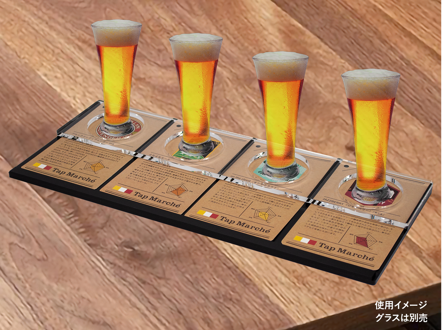 タップ・マルシェ 4種類(4タップ)のブランド識別シートが入る飲み比べトレイ(Beer Flight)です。