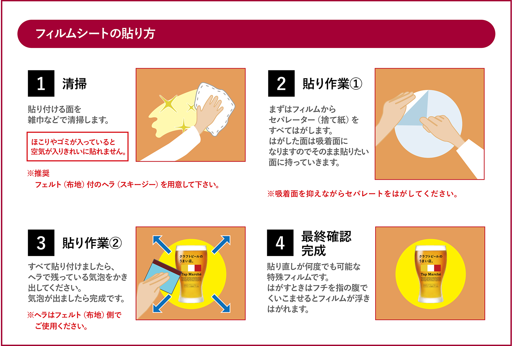 貼付時はもちろん、貼り直しの際には汚れが付かないよう十分ご注意ください。